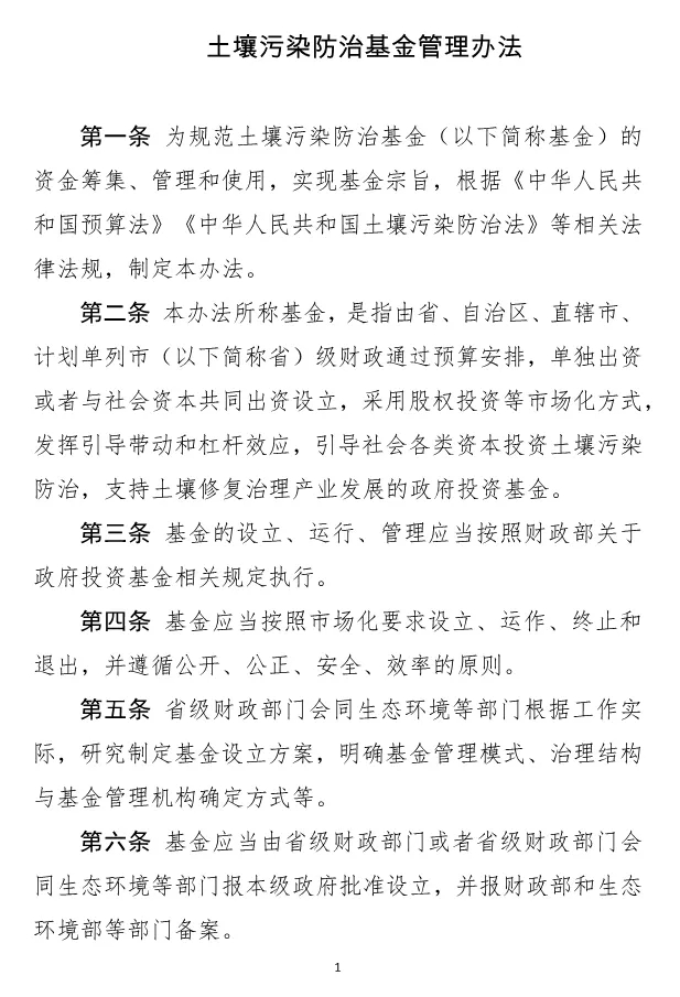為規(guī)范土壤污染防治基金的資金籌集、管理和使用,實現(xiàn)基金宗旨,根據(jù)《中華人民共和國預(yù)算法》《中華人民共和國土壤污染防治法》等相關(guān)法律法規(guī),我們制定了《土壤污染防治基金管理辦法》。現(xiàn)予印發(fā),請遵照執(zhí)行。